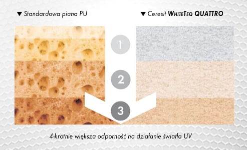 Zwarta struktura wewnętrzna oraz zwiększona odporność mechaniczna sprawiają, że Ceresit WHITETEQ QUATTRO jest doskonałym produktem nadającym się do prac instalacyjnych i montażowych – zarówno wewnątrz, jak i na zewnątrz pomieszczeń. Pianka ma znakomitą przyczepność do betonów, murów, tynków, metali, drewna, styropianu, papieru, powłok malarskich i tworzyw sztucznych (z wyjątkiem polietylenu, teflonu, silikonu).