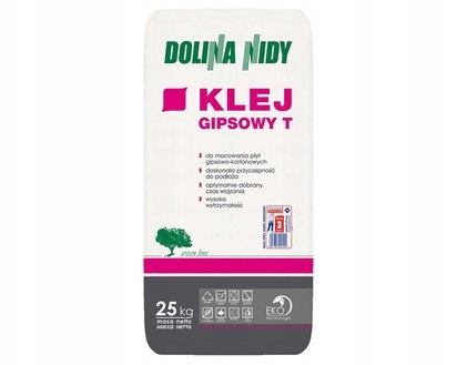 Dolina Nidy Klej gipsowy T 25 kg przeznaczony jest do mocowania płyt gipsowo-kartonowych oraz do płyt zespolonych do izolacji cieplnej i akustycznej ścian wewnątrz budynków. Skład kleju został uzupełniony dodatkowymi składnikami modyfikującymi, dzięki którym konsystencja kleju jest plastyczna i łatwo się go rozprowadza. Dobrze dobrany czas wiązania kleju sprawia, że montaż jest efektywny i stabilny.