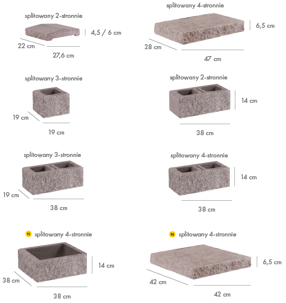 Dzięki technologii splitowania uzyskano niepowtarzalną fakturę każdego z elementów. Do złudzenia przypominają one naturalny kamień, który znakomicie prezentuje się w aranżacjach wypełnionych zielenią. Aby uzyskać spójną kompozycję, warto dopełnić ją pozostałymi elementami z linii Split: postarzaną cegłą, palisadą lub stopniami schodowymi.