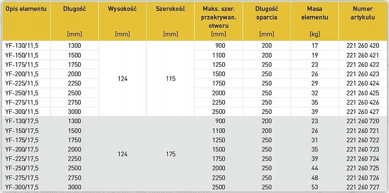 - możliwość przekrywania otworów o szerokości do 102 cm (Ytong YD), 175 cm (Ytong YN) lub 250 cm (Ytong YF).